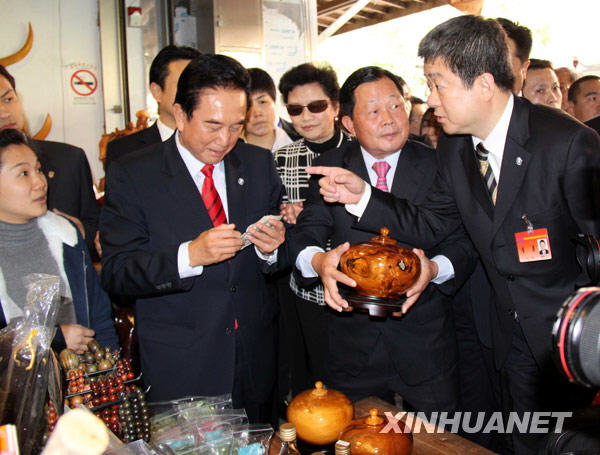 12月23日,海協(xié)會會長陳云林(前左二)參觀三義木雕博物館后,來到博物館邊的工藝小店,購買當(dāng)?shù)靥厣镜窆に嚻贰P氯A社記者 徐群 攝