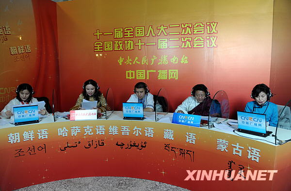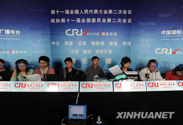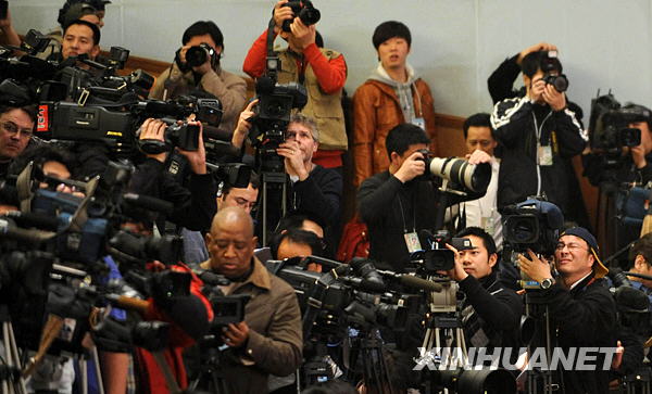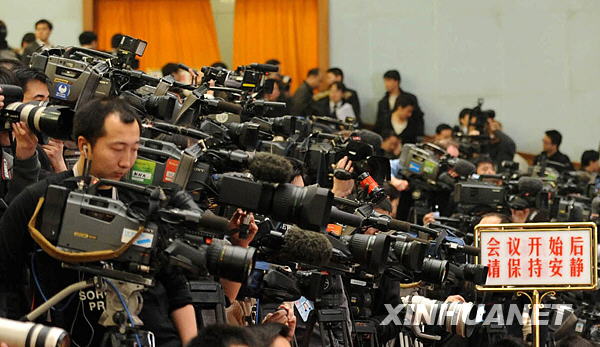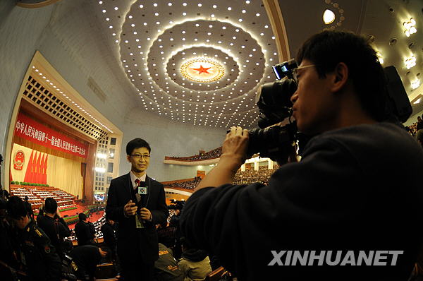3月5日,第十一屆全國人民代表大會第二次會議在北京人民大會堂開幕。這是記者在會場采訪。新華社記者 黃敬文攝