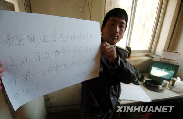 3月9日,在北京一單位門(mén)衛(wèi)室內(nèi),來(lái)自甘肅的趙永康說(shuō),希望代表、委員們能夠關(guān)注農(nóng)民工的工作時(shí)間長(zhǎng)和工資待遇問(wèn)題;希望關(guān)注他們家鄉(xiāng)的環(huán)境問(wèn)題。