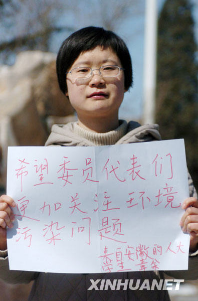 3月9日,中國(guó)人民大學(xué)學(xué)生章余說(shuō),希望兩會(huì)的代表、委員們能夠更多關(guān)注環(huán)境污染問(wèn)題。新華社記者 郭晨 攝