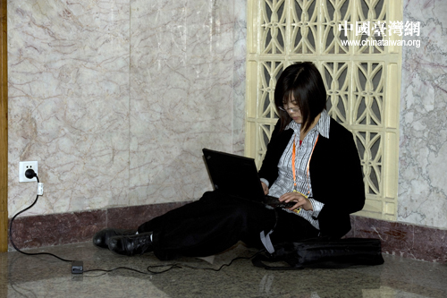 這位女記者為了趕發(fā)稿件,在人民大會堂席地而坐。 (中國臺灣網(wǎng)發(fā) 肖春陽、劉洋攝)