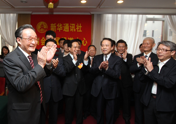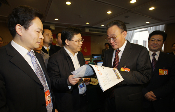 3月13日,中共中央政治局常委、全國人大常委會(huì)委員長吳邦國親切看望新華社兩會(huì)報(bào)道人員。圖為新華社副總編輯吳錦才向吳邦國委員長匯報(bào)《新華每日電訊》刊登的《為法治中國的宏偉大廈奠基——寫在形成中國特色社會(huì)主義法律體系邁出決定性步伐之際》一稿,吳邦國委員長說:“我看到這篇稿子了,寫得很好!” 新華社記者邢廣利 攝