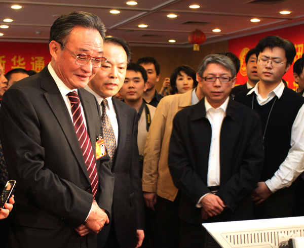 3月13日,中共中央政治局常委、全國人大常委會(huì)委員長吳邦國親切看望新華社兩會(huì)報(bào)道人員。圖為吳邦國委員長在瀏覽新華網(wǎng)兩會(huì)專題報(bào)道。新華社記者李響 攝