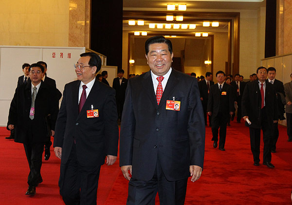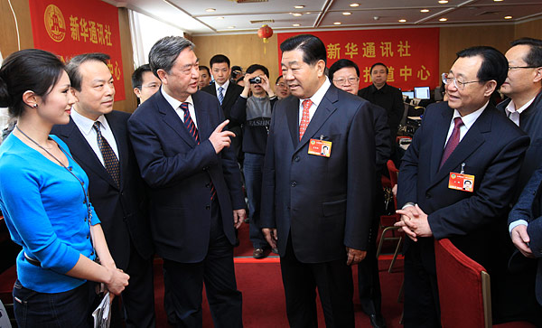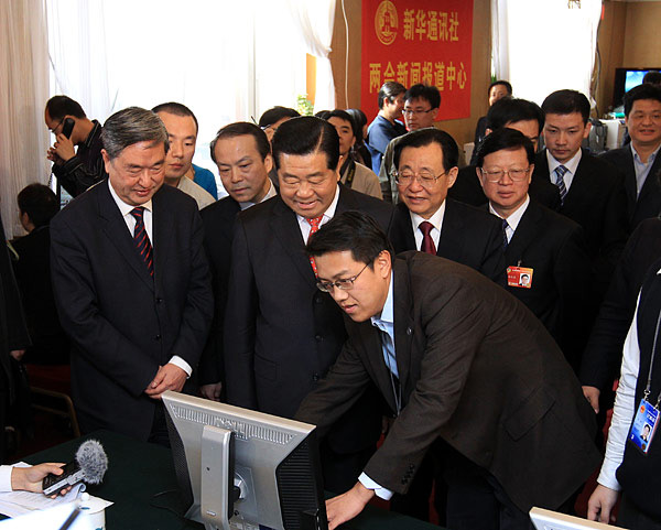 3月13日,中共中央政治局常委、全國政協(xié)主席賈慶林親切看望新華社兩會(huì)前方報(bào)道人員。新華社記者 龐興雷 攝