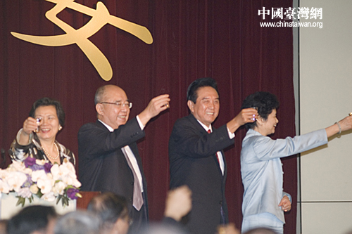 中國(guó)國(guó)民黨主席吳伯雄5日晚在臺(tái)北晶華飯店設(shè)宴歡迎海協(xié)會(huì)協(xié)商代表團(tuán)陳云林一行。宴會(huì)現(xiàn)場(chǎng)云集了島內(nèi)多位政商名流。吳伯雄與陳云林分別致辭,賓主共同舉杯,為兩岸關(guān)系和平發(fā)展許下美好祝愿。(田云鵬 攝)
