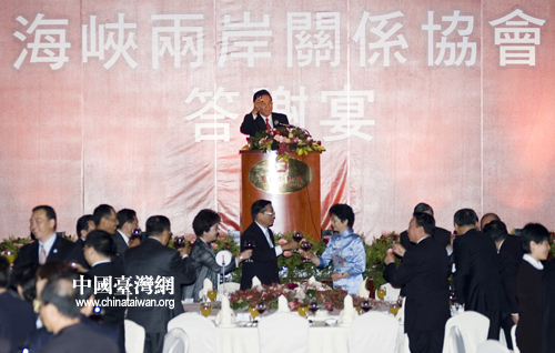 海峽兩岸關(guān)系協(xié)會(huì)6日晚在臺(tái)北市圓山飯店舉行答謝晚宴,感謝;鶗(huì)董事長(zhǎng)及;鶗(huì)主要工作人員。陳云林致辭后賓主共同舉杯慶祝。田云鵬 攝