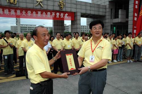 2006年7月,在2006“寶島行”海峽兩岸大學(xué)生夏令營開營儀式上,海南省臺(tái)辦主任徐剛向臺(tái)灣南榮技術(shù)學(xué)院院長葉茂榮教授贈(zèng)送紀(jì)念品。(圖片來源:中國新聞網(wǎng))
