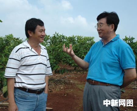 2006年10月,海南省臺(tái)辦徐剛主任(右)到定安縣臺(tái)資農(nóng)場金德豐公司察看蓮霧長勢,左為臺(tái)商黃益豐。(圖片來源:中國新聞網(wǎng))