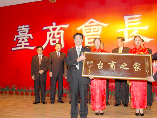 2006年8月30日,山東省臺(tái)辦主任楊慶文接受臺(tái)商會(huì)長(zhǎng)們贈(zèng)送“臺(tái)商之家”牌匾 |