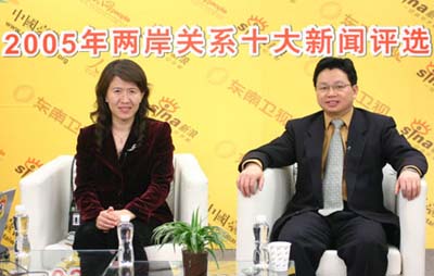 由中國(guó)臺(tái)灣網(wǎng)、人民網(wǎng)、新浪網(wǎng)、東南衛(wèi)視聯(lián)合推出的“2005年兩岸關(guān)系十大新聞”評(píng)選活動(dòng)于2006年1月1日正式啟動(dòng)。作為評(píng)選活動(dòng)的重要組成部分,1月17日13時(shí)至14時(shí),全國(guó)臺(tái)聯(lián)聯(lián)絡(luò)部部長(zhǎng)、前全國(guó)臺(tái)聯(lián)研究室副主任、全國(guó)臺(tái)灣研究會(huì)理事楊毅周教授(右),社科院臺(tái)灣研究所政治研究室主任謝郁(左)就臺(tái)商春節(jié)包機(jī)、送臺(tái)六項(xiàng)大禮等問題接受在線訪談。