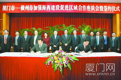 兩市舉行了加強(qiáng)海西建設(shè)促進(jìn)區(qū)域合作座談會(huì),廈門市委副書記、市長(zhǎng)劉賜貴和贛州市委副書記、市長(zhǎng)蔡曉明分別介紹了兩市的經(jīng)濟(jì)社會(huì)發(fā)展情況,福建省發(fā)改委副主任鄭勇簡(jiǎn)要介紹“海西”戰(zhàn)略的重要意義和主要內(nèi)容。兩市領(lǐng)導(dǎo)就加強(qiáng)海西建設(shè),促進(jìn)兩地合作的有關(guān)問(wèn)題進(jìn)行了座談交流,劉賜貴、蔡曉明代表兩市簽訂了《關(guān)于加強(qiáng)“海西”建設(shè),進(jìn)一步推進(jìn)區(qū)域合作的協(xié)議書》。