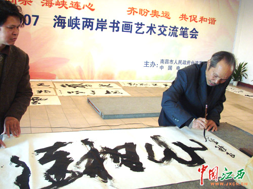 著名書(shū)法美術(shù)家何報(bào)榴,以“逆水行舟”筆法,在宣紙上倒寫(xiě)出“心相連”三個(gè)大字,表達(dá)對(duì)“兩岸一心相連,共創(chuàng)和諧社會(huì)”的美好祝愿。(中國(guó)江西新聞網(wǎng)記者 楊冗晟 攝)