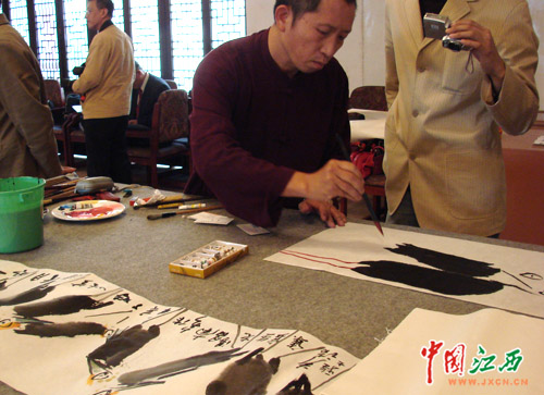 當(dāng)日,海峽兩岸書(shū)畫(huà)藝術(shù)交流筆會(huì)在南昌市畫(huà)院舉行,李豆羅為筆會(huì)開(kāi)筆。接著,臺(tái)灣中華書(shū)學(xué)會(huì)理事長(zhǎng)嚴(yán)建忠提筆寫(xiě)下“惜緣”二字,表達(dá)出現(xiàn)場(chǎng)十余位書(shū)畫(huà)藝術(shù)家的共同心聲:兩岸同宗,海峽連心,齊盼奧運(yùn),共促和諧。龔朝陽(yáng)、何正一、簡(jiǎn)英智、吳金城,游新民、周京山、王迎春、張維欣等海峽兩岸書(shū)畫(huà)藝術(shù)家也分別留下作品,表達(dá)美好祝愿。