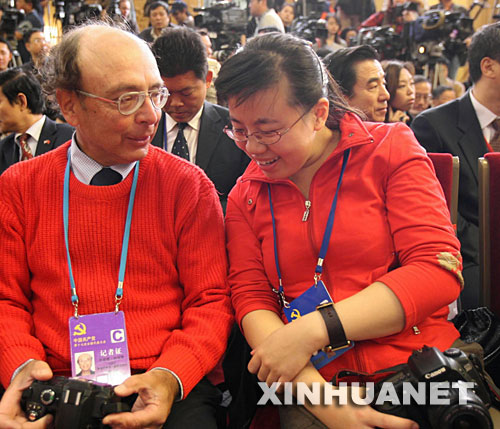 10月22日,十七屆中央政治局常委在北京人民大會(huì)堂與中外記者見面。身穿紅色衣服的記者成為記者席中的亮點(diǎn)。 新華社記者 邢廣利攝