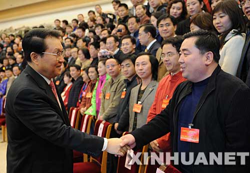 11月13日,全國青年作家創(chuàng)作會議在北京召開。中共中央政治局常委李長春出席會議并講話。這是李長春接見出席會議的代表。 新華社記者李學(xué)仁攝