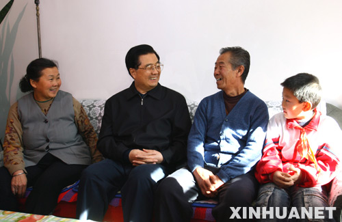 11月17日至19日,中共中央總書記、國(guó)家主席、中央軍委主席胡錦濤在內(nèi)蒙古自治區(qū)考察工作。這是胡錦濤在呼和浩特市新城區(qū)西落鳳街低保戶周云家中噓寒問(wèn)暖。 新華社記者鞠鵬攝