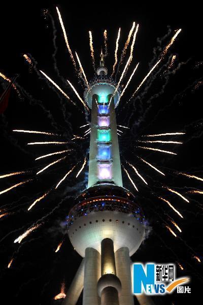 4月30日晚,東方明珠塔被燈光、焰火裝扮得分外美麗。當(dāng)晚,中國2010年上海世博會(huì)開幕式大型燈光噴泉焰火表演在上海舉行。