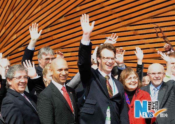 5月1日,參加加拿大館開館儀式的嘉賓和全體工作人員在展館前合影留念。當(dāng)日上午9時(shí),位于上海世博園C片區(qū)的加拿大館舉行開館儀式。新華社記者王頌攝