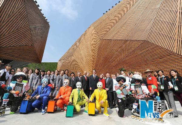 5月1日,參加加拿大館開館儀式的嘉賓向游客揮手致意。當(dāng)日上午9時(shí),位于上海世博園C片區(qū)的加拿大館舉行開館儀式。 新華社記者王頌攝