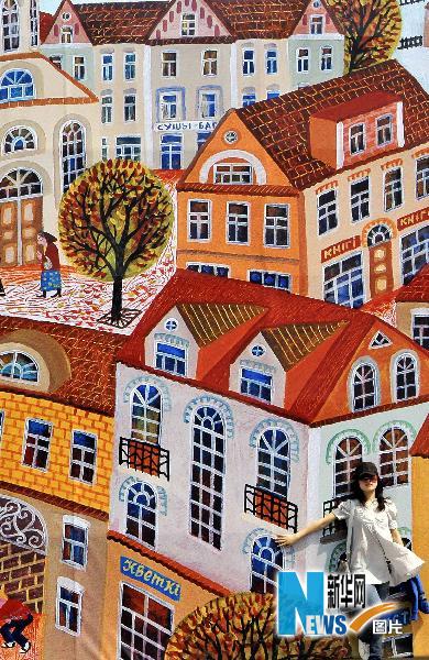 白俄羅斯館外立面上繪有街景圖畫(5月2日攝)。
