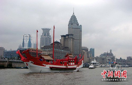 這艘1:1復(fù)制的“遣唐使船”整個行駛當(dāng)中左右兩側(cè)各有一艘海事巡邏艇護(hù)航的。據(jù)了解,“遣唐使船”是5月8日從當(dāng)年的出發(fā)地,也就是日本大阪港啟航的,沿著先人的航路,一路向黃埔江畔的上海世博會會場前行,續(xù)寫了五千年前中日兩國友好交流的傳奇。