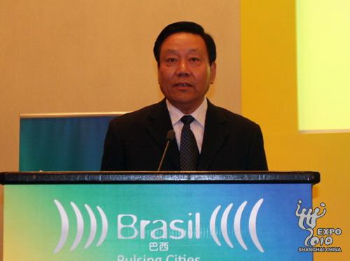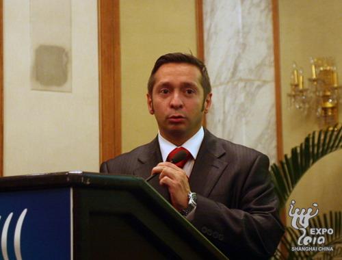 巴西貿易與投資促進局主席、世界投資促進機構協(xié)會主席兼上海世博會巴西館總代表亞歷山德羅?特謝拉介紹展館情況