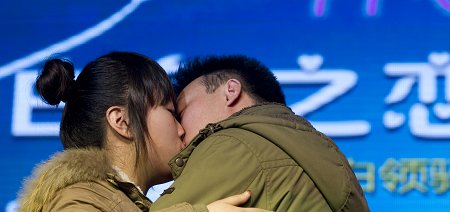 昨日,上海靜安體育館,一對男女在“白色情人節(jié)”相親會上當眾表白后擁吻。早報記者 魯海濤 圖