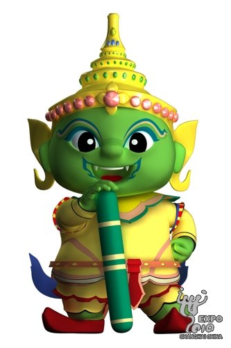 世博會(huì)期間,泰國(guó)館吉祥物“小阿泰”每天將以歡樂(lè)、友善的微笑,帶領(lǐng)游行隊(duì)伍穿梭于人群中以吸引注意,并邀請(qǐng)參觀者體驗(yàn)泰國(guó)館中精彩的視聽(tīng)展示!靶“⑻钡拿謥(lái)自泰語(yǔ)的“自由”和“獨(dú)立”,設(shè)計(jì)靈感來(lái)自泰國(guó)寺廟門(mén)前的守護(hù)神!靶“⑻钡钠つw是綠色的,代表富饒的泰國(guó)大地,橢圓形的大眼睛如同泰國(guó)人友好和善良的心靈窗口,自然純真的微笑充滿溫馨和友善,手握的巨棒具有創(chuàng)造幸福、實(shí)現(xiàn)夢(mèng)想的神奇威力。