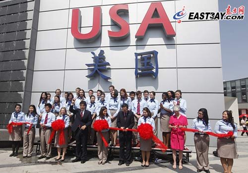 東方網(wǎng)世博報(bào)道組記者劉華賓、劉歆5月3日?qǐng)?bào)道:外形猶如雄鷹展翅的上海世博會(huì)美國國家館,今天上午正式舉行開館儀式,美國駐滬總領(lǐng)事康碧翠、美國館總代表費(fèi)樂友、上海世博局副局長黃健之為美國館開館剪裁?当檀浜唾M(fèi)樂友用中文熱情地向參觀游客表示歡迎,從美國各州選來的大學(xué)生親善大使也將用流利的中文向游客介紹多元、合作、創(chuàng)新的美國精神。