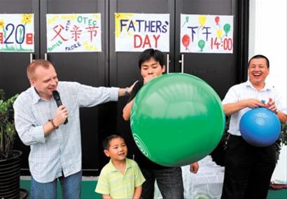 參與互動游戲的父親們正在比賽吹氣球。昨天,斯洛伐克館為父親節(jié)舉行了一個慶;顒,工作人員與現(xiàn)場觀眾開展互動游戲。