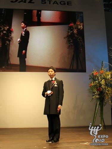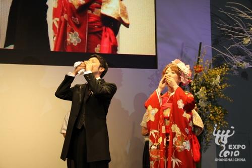 日本產(chǎn)業(yè)館JAL舞臺(tái)上,來自橫濱的新郎岡陽介身穿西式禮服首先登場(chǎng)。之后,同樣來自橫濱的新娘岡美緒身著正紅色、由3層衣服組成的日本傳統(tǒng)服飾――和服,腳踩木屐,在父親的引領(lǐng)下出現(xiàn)在觀眾面前。在兩位新人宣讀誓言、喝下交杯酒后,一位現(xiàn)場(chǎng)觀眾被邀請(qǐng)上臺(tái)作為證婚人之一,和新娘父母、主持人、歌手小松拓也一起在結(jié)婚證明書上簽字,見證兩人的結(jié)合。隨后,新人互換戒指,新郎向新娘送上深情一吻,至此,兩位新人正式結(jié)為夫婦,而現(xiàn)場(chǎng)觀眾也在此時(shí)送上了陣陣掌聲和祝福。