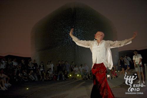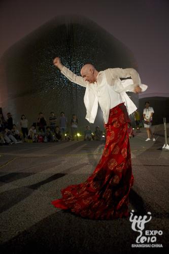 5日晚上,英國(guó)藝術(shù)家艾倫·格瑞格(Alan Greig)在“種子圣殿”前展現(xiàn)了精彩絕倫的蘇格蘭現(xiàn)代舞蹈藝術(shù)。艾倫 格瑞格是X Factor舞團(tuán)的藝術(shù)總監(jiān),他的舞蹈作品集運(yùn)動(dòng)、刺激與娛樂性于一體,此次演出片段是根據(jù)他在2009年上海舞蹈節(jié)中首演的獨(dú)舞《Into the Light》改編而成。