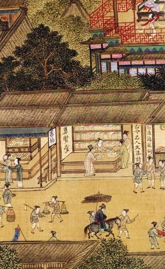 畫中大街小巷,店鋪林立,酒店、茶館、點心鋪等百肆雜陳,還有城樓、河港、橋梁、貨船、官府宅第和茅棚村舍密集。這樣波瀾壯闊的社會風(fēng)俗畫卷,世所罕見。