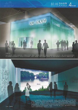杭州館的設(shè)計(jì)是圍繞水與人的生活主線,通過(guò)“讀水”、“說(shuō)水”、“聽(tīng)水”和“品水”,展示杭州自古以來(lái)治理“五水”(西湖、運(yùn)河、西溪、錢(qián)塘江、東海)而換取品質(zhì)生活的主題。