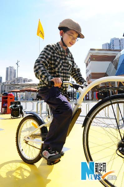 5月7日,楊焱淇在體驗歐登塞自行車。新華社記者 程敏 攝