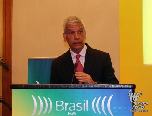巴西貿(mào)易與投資促進(jìn)局主席、世界投資促進(jìn)機(jī)構(gòu)協(xié)會(huì)主席兼上海世博會(huì)巴西館總代表亞歷山德羅?特謝拉介紹展館情況