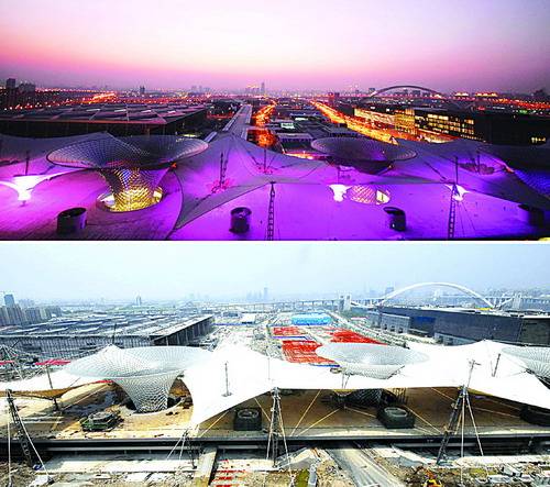 1月21日,上海將迎來世博會開幕倒計時100天。目前,世博園區(qū)場館建設進入尾聲,上海世博園區(qū)正在以嶄新、完美的姿態(tài)迎接世博會的到來。上圖:世博會倒計時100天之際拍攝的進行夜景燈光調(diào)試的世博中心和世博軸(2010年1月18日攝)。下圖:世博會倒計時300天之際拍攝的世博中心和世博軸(2009年7月5日攝)。