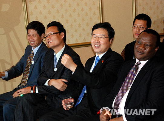 1月21日,在南非首都約翰內(nèi)斯堡,中國駐約翰內(nèi)斯堡總領(lǐng)事房利(右二)為世博會(huì)加油。