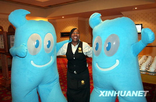1月21日,在南非首都約翰內(nèi)斯堡,幾名當(dāng)?shù)厍嗄昱c上海世博會(huì)吉祥物“海寶”合影。新華社發(fā)(梁銓攝)