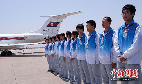 朝鮮最高人民會(huì)議常任委員會(huì)委員長(zhǎng)金永南乘坐專機(jī)抵達(dá)上海,上海世博會(huì)志愿者到機(jī)場(chǎng)迎接