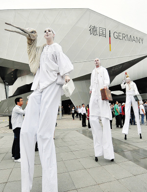 德國(guó)館前,德國(guó)藝術(shù)家腳踩高蹺前來(lái)助興 孫中欽攝