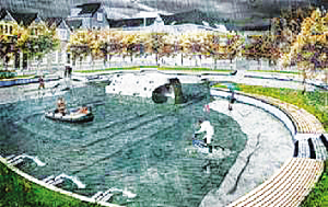水廣場由幾個(gè)形狀、大小和高度各不相同的水池組成,水池間有渠相連。平時(shí)是市民娛樂休閑的廣場;暴雨來臨,就變成一個(gè)防澇系統(tǒng)。由于雨水流向地勢更低洼的水廣場,街道上就不會有積水。所有水池布成一張循環(huán)網(wǎng)絡(luò),雨量大時(shí),從大水池中分流到溝渠,雨量小時(shí),水又回流入大水池。雨水不僅可在水池間循環(huán)流動(dòng),還能被抽取儲存為淡水資源。
