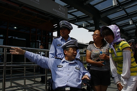 東方網(wǎng)5月26日消息:據(jù)《東方早報(bào)》報(bào)道,昨天上午,世博秦皇島路水門碼頭上,出現(xiàn)了這樣一幕:一名交警坐著輪椅“執(zhí)勤”,解答過(guò)往游客的問(wèn)題。他叫喬明德,是楊浦交警支隊(duì)的民警,今年7月將退休,一個(gè)月前被診斷出患有肝癌。昨天,他實(shí)現(xiàn)心愿——為世博出一份力,站一班崗。