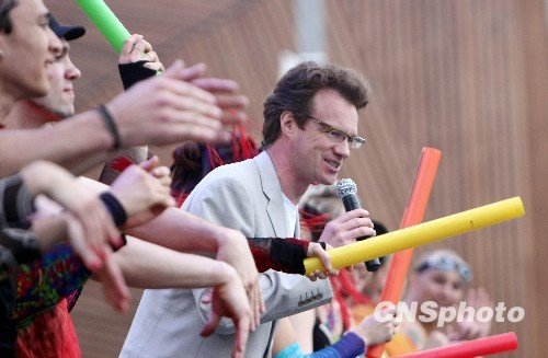 資料圖:5月14日,加拿大的藝術(shù)團(tuán)在上海世博會(huì)上演了一場(chǎng)精彩的馬戲表演,吸引了眾多游客冒雨觀看。圖為大山主持表演。 中新社發(fā) 杜洋 攝