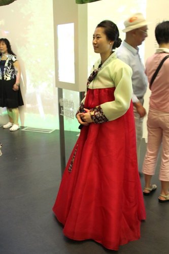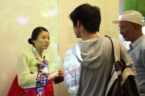 “請點擊屏幕上這個箭頭,就可以開始游戲了,電腦上一共有10個小游戲,都是有關(guān)節(jié)能環(huán)保主題的……”在2樓的“自然”展區(qū),姜寶蘭操著一口流利的漢語,微笑著為游客們講解,聲音中帶著韓國傳統(tǒng)女性特有的溫柔!邦^上的綠色織物是用韓國傳統(tǒng)工藝織成的麻布,象征著綠色的大森林!闭驹诰G色的布幔之下,身著紅色韓服的姜寶蘭顯得甜美可愛。不斷有游客上前要求與她合影,姜寶蘭打著手勢拒絕了,有些羞澀的躲避著游客的鏡頭,“公司不允許,很抱歉。”
