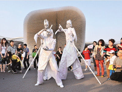 6月1日,上海世博園英國館入館人數(shù)大幅增加,英國館的演員在館外進(jìn)行一種未來超能量科技球的演示,他們用幽默、夸張的表演與觀眾親密互動(dòng)。新華社記者 何俊昌攝