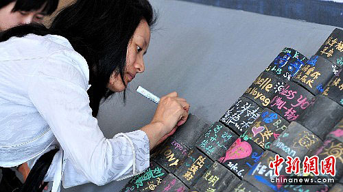 6月13日,蘇州市民在“世博瓦”上留下祝福!笆啦┩摺笔巧虾J啦⿻囊豁(xiàng)創(chuàng)意,寓意為世博“添磚加瓦”。中新社發(fā) 李克祥 攝