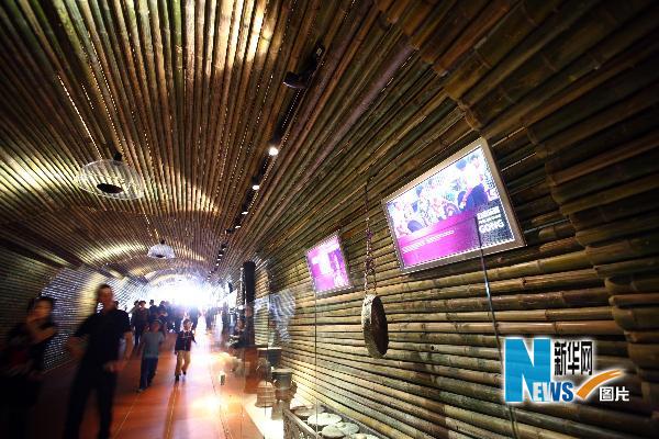 游客在印度尼西亞館內(nèi)用竹子裝飾的展覽通道中參觀(5月3日攝)。 新華社記者 王迎 攝