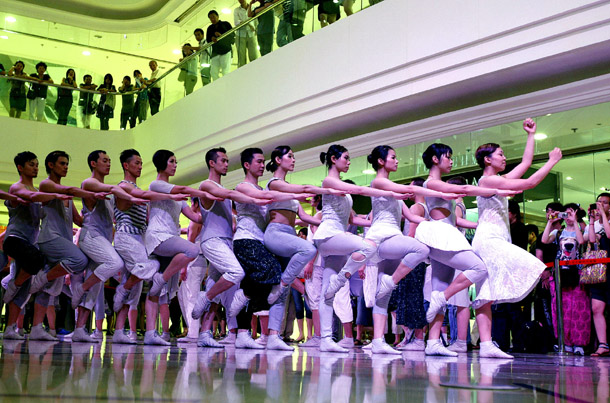 6月20日,香港舞蹈演員在商場里翩翩起舞。當(dāng)日,參加上海世博園文藝演出的香港城市當(dāng)代舞蹈團(tuán),專程來到上海市淮海路上的大上海時(shí)代廣場,為南來北往的游客獻(xiàn)上一場主題為《衣食住行》的舞蹈表演。在表演過程中,演員不時(shí)走到購物的游客中間起舞,讓觀眾零距離欣賞走出殿堂的舞蹈藝術(shù)。新華社記者 陳飛 攝