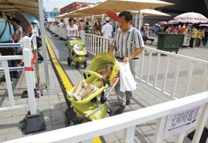 由于對綠色通道的新標準不了解,而且各展館的標準并未統(tǒng)一,很多參觀者仍然推著輪椅或嬰兒車過來排隊,館方工作人員只能不停地向參觀者解釋新規(guī)定。
